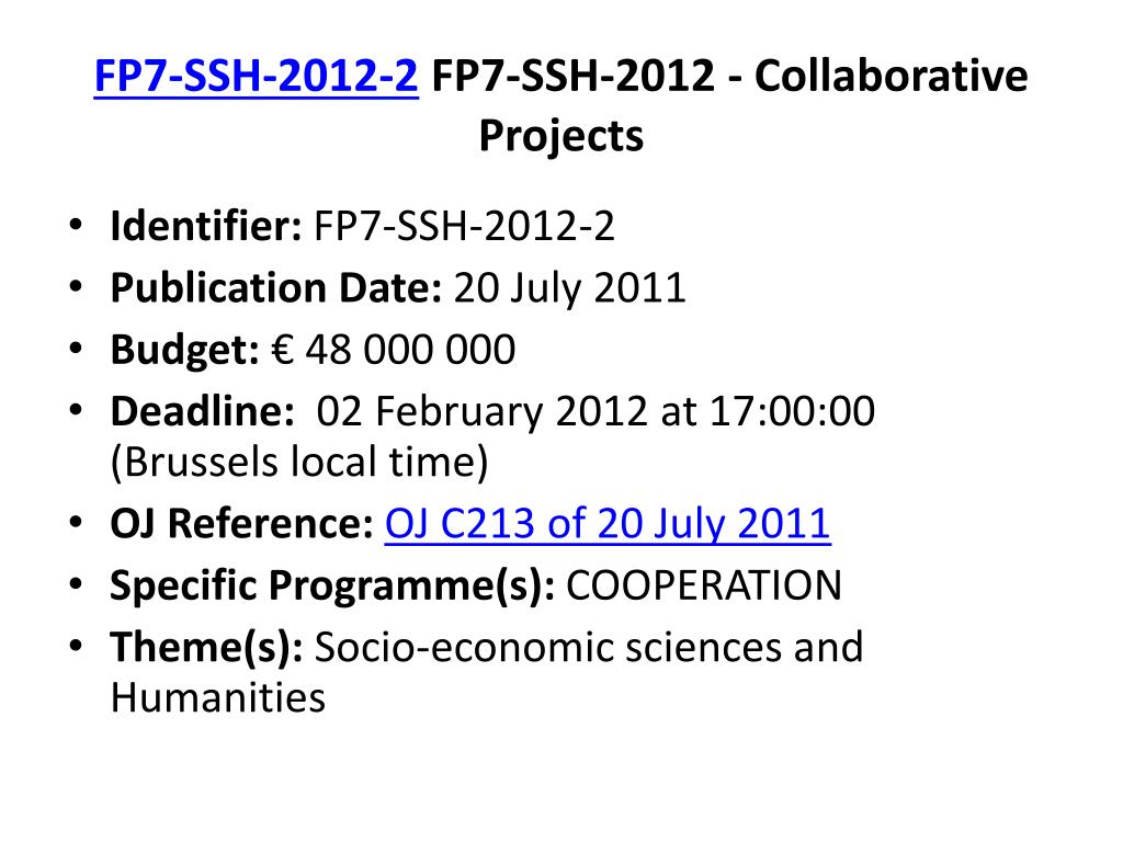 FP7-SSH-2012-2 FP7-SSH-2012 - Collaborative Projects • Identifier: FP7-SSH-2012-2 • Publication Date: 20 July 2011 • Budget: € 48 000 000 • Deadline: 02 February 2012 at 17:00:00 (Brussels local time) • OJ Reference:OJ C213 of 20 July 2011 • Specific Programme(s): COOPERATION • Theme(s): Socio-economic sciences and Humanities