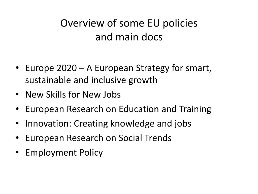 Overview of some EU policies and main docs • Europe 2020 – A European Strategy for smart, sustainable and inclusive growth • New Skills for New Jobs • European Research on Education and Training • Innovation: Creating knowledge and jobs • European Research on Social Trends • Employment Policy