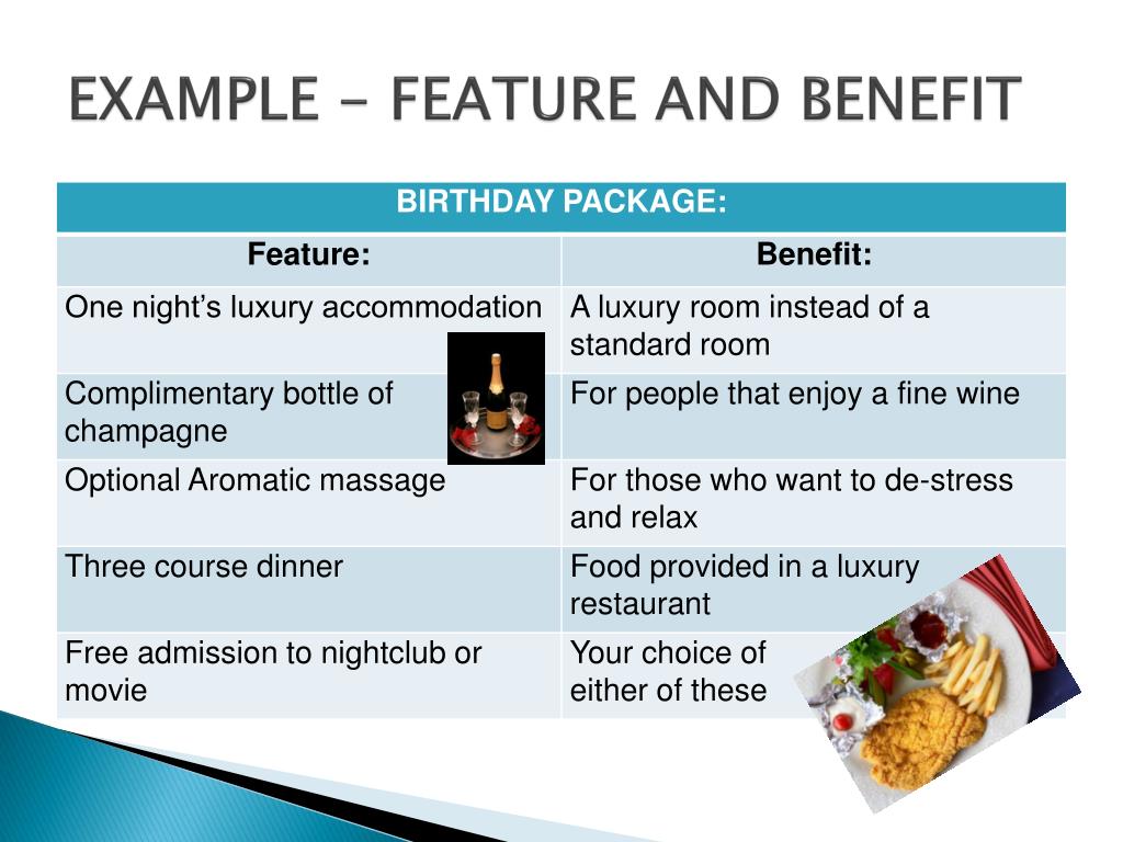 BENEFIT • A benefit is what the customer perceives they receive when they use the product. Though these may be difficult to measure and may vary by user. Benefits such as effectiveness, durability, speed, ease-of-use, and cost savings to name just few. Benefit of eating in a restaurant – nice environment/good food/clean area.
