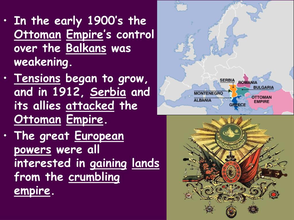 In the early 1900’s the OttomanEmpire’s control over the Balkans was weakening. • Tensions began to grow, and in 1912, Serbia and its allies attacked the OttomanEmpire. • The great Europeanpowers were all interested in gaininglands from the crumblingempire.