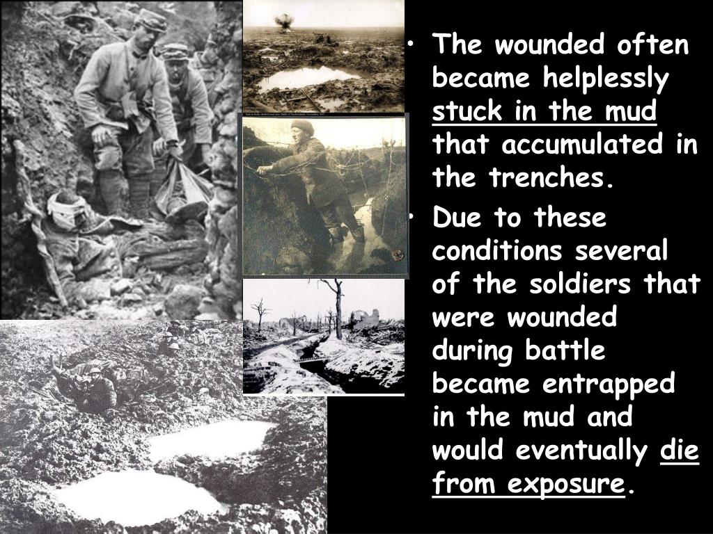 The wounded often became helplessly stuck in the mud that accumulated in the trenches. • Due to these conditions several of the soldiers that were wounded during battle became entrapped in the mud and would eventually die from exposure.