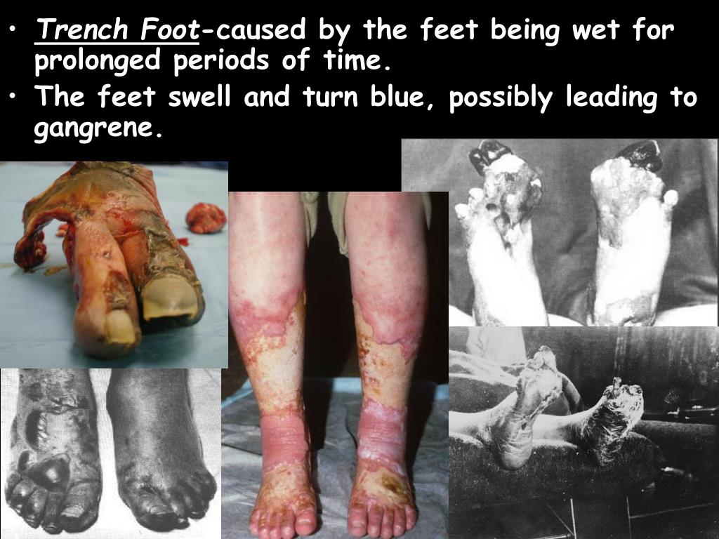 Trench Foot-caused by the feet being wet for prolonged periods of time. • The feet swell and turn blue, possibly leading to gangrene.