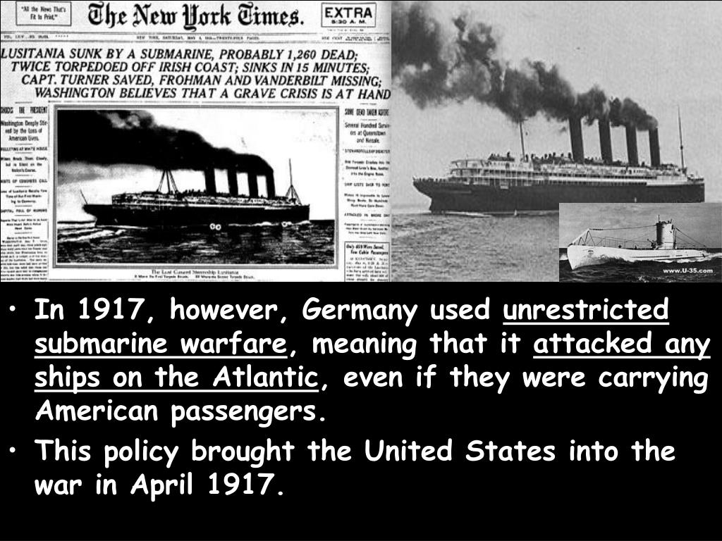 In 1917, however, Germany used unrestricted submarine warfare, meaning that it attacked any ships on the Atlantic, even if they were carrying American passengers. • This policy brought the United States into the war in April 1917.