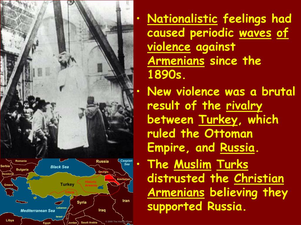 Nationalistic feelings had caused periodic wavesofviolence against Armenians since the 1890s. • New violence was a brutal result of the rivalry between Turkey, which ruled the Ottoman Empire, and Russia. • The MuslimTurks distrusted the ChristianArmenians believing they supported Russia.