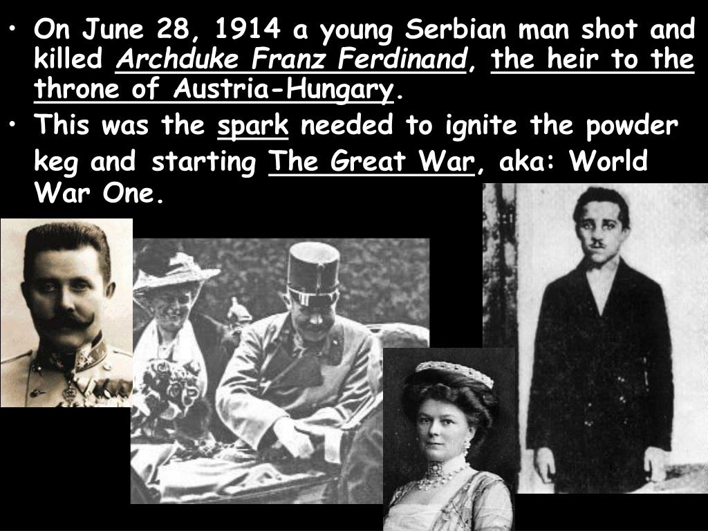On June 28, 1914 a young Serbian man shot and killed Archduke Franz Ferdinand, the heir to the throne of Austria-Hungary. • This was the spark needed to ignite the powder keg andstarting The Great War, aka: World War One.