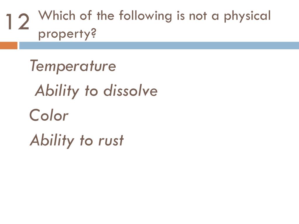 12 Which of the following is not a physical property? Temperature Ability to dissolve Color Ability to rust