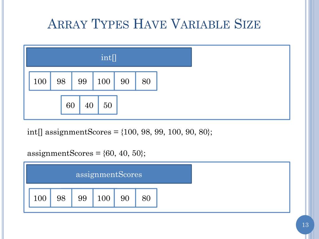 Array Types Have Variable Size int[] 100 98 99 100 90 80 60 40 50 int[] assignmentScores = {100, 98, 99, 100, 90, 80}; assignmentScores = {60, 40, 50}; assignmentScores 100 98 60 99 40 100 50 90 80