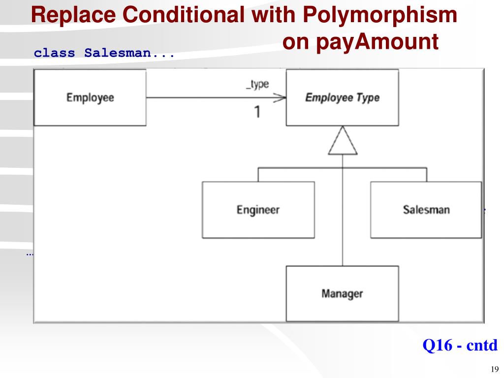 Replace Conditional with Polymorphism on payAmount class Salesman... intpayAmount(Employeeemp) { return emp.getMonthlySalary() + emp.getCommission(); } class Manager... intpayAmount(Employeeemp) { return emp.getMonthlySalary() + emp.getBonus(); } … class EmployeeType... abstract intpayAmount(Employeeemp); Declare superclass method abstract Q16 - cntd