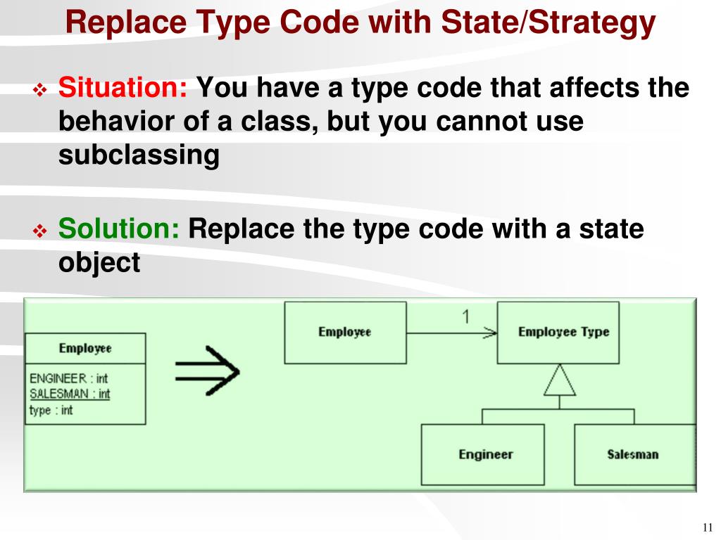 Replace Type Code with State/Strategy class Employee { private int _type; static final int ENGINEER = 0; static final int SALESMAN = 1; static final int MANAGER = 2; Employee (int type) {_type = type;) } intpayAmount() { switch (_type) { case ENGINEER: return _monthlySalary; case SALESMAN: return _monthlySalary + _commission; case MANAGER: return _monthlySalary + _bonus; default: throw new Exception("Incorrect Code"); } } Q15