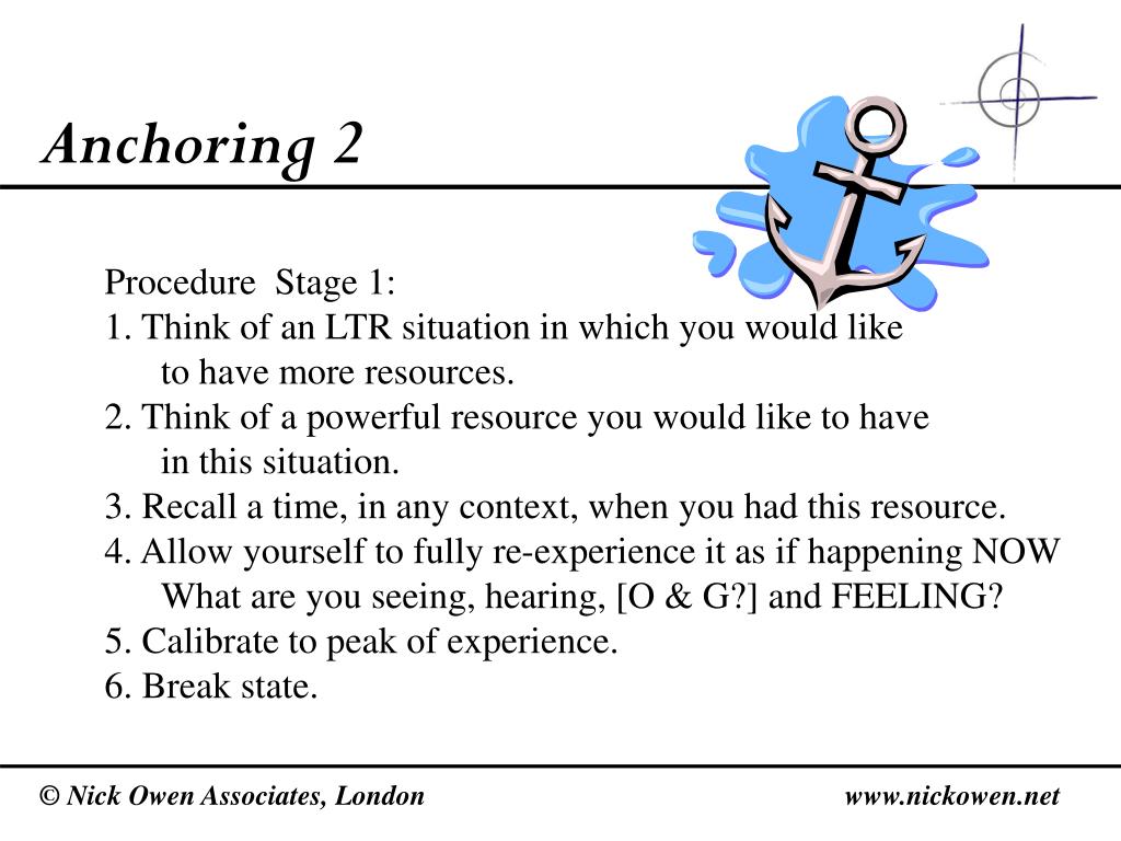 Anchoring 2 Procedure Stage 1: 1. Think of an LTR situation in which you would like to have more resources. 2. Think of a powerful resource you would like to have in this situation. 3. Recall a time, in any context, when you had this resource. 4. Allow yourself to fully re-experience it as if happening NOW What are you seeing, hearing, [O & G?] and FEELING? 5. Calibrate to peak of experience. 6. Break state.