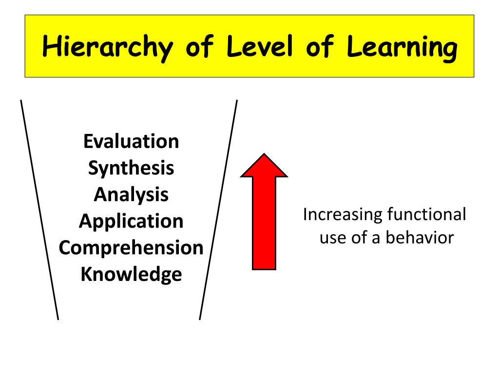 Hierarchy of Level of Learning Evaluation Synthesis Analysis Application Comprehension Knowledge Increasing functional use of a behavior