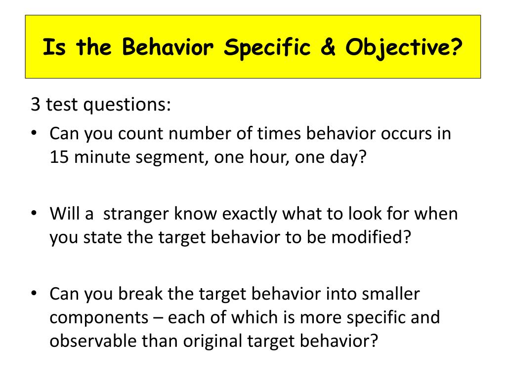 Is the Behavior Specific & Objective? 3 test questions: • Can you count number of times behavior occurs in 15 minute segment, one hour, one day? • Will a stranger know exactly what to look for when you state the target behavior to be modified? • Can you break the target behavior into smaller components – each of which is more specific and observable than original target behavior?