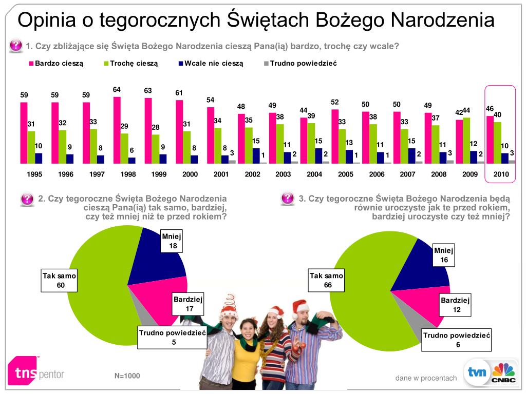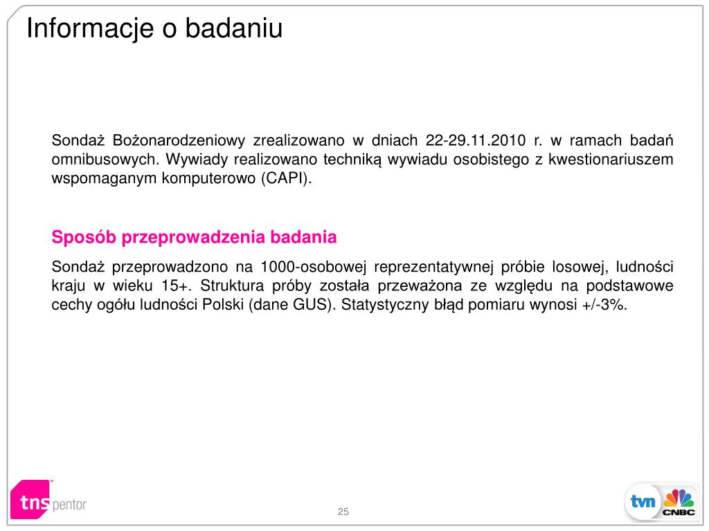Informacje o badaniu Sondaż Bożonarodzeniowy zrealizowano w dniach 22-29.11.2010 r. w ramach badań omnibusowych. Wywiady realizowano techniką wywiadu osobistego z kwestionariuszem wspomaganym komputerowo (CAPI). Sposób przeprowadzenia badania Sondaż przeprowadzono na 1000-osobowej reprezentatywnej próbie losowej, ludności kraju w wieku 15+. Struktura próby została przeważona ze względu na podstawowe cechy ogółu ludności Polski (dane GUS). Statystyczny błąd pomiaru wynosi +/-3%.