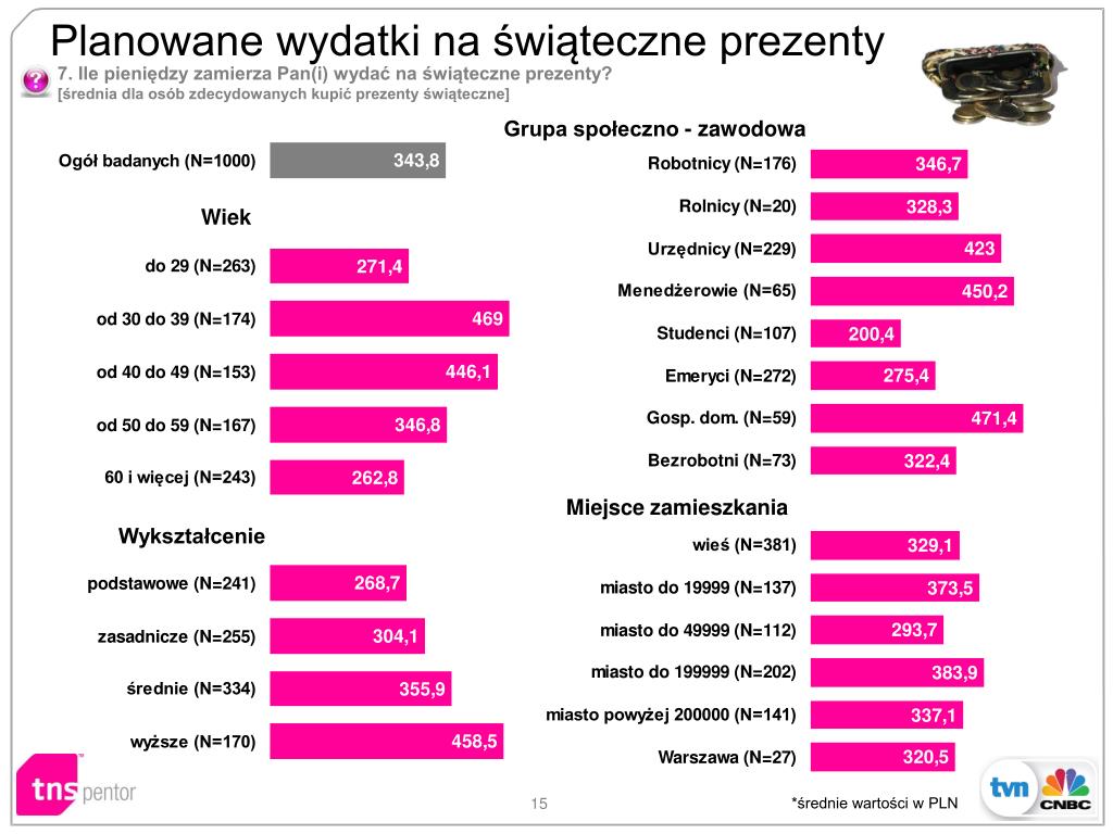 Planowane wydatki na świąteczne prezenty 7. Ile pieniędzy zamierza Pan(i) wydać na świąteczne prezenty?[średnia dla osób zdecydowanych kupić prezenty świąteczne] Grupa społeczno - zawodowa Wiek Miejsce zamieszkania Wykształcenie *średnie wartości w PLN
