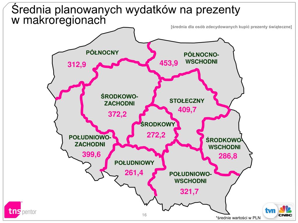 Średnia planowanych wydatków na prezenty w makroregionach [średnia dla osób zdecydowanych kupić prezenty świąteczne] PÓŁNOCNY PÓŁNOCNO- WSCHODNI 453,9 312,9 ŚRODKOWO- ZACHODNI STOŁECZNY 409,7 372,2 ŚRODKOWY 272,2 POŁUDNIOWO- ZACHODNI ŚRODKOWO- WSCHODNI 399,6 286,8 POŁUDNIOWY 261,4 POŁUDNIOWO- WSCHODNI 321,7 *średnie wartości w PLN