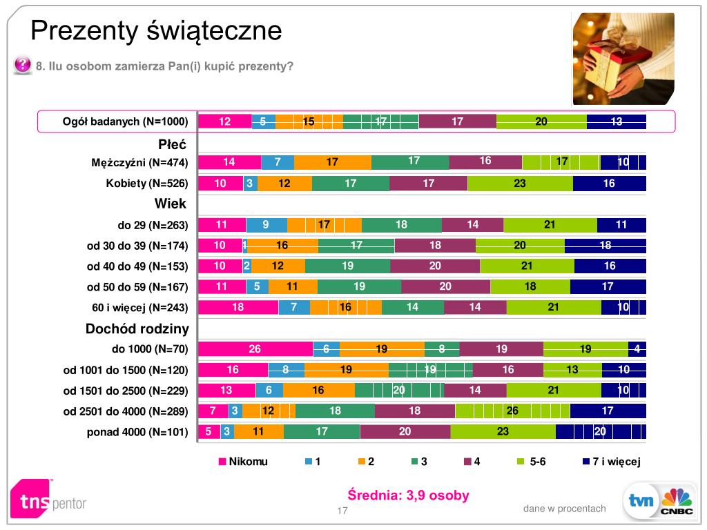 Prezenty świąteczne 8. Ilu osobom zamierza Pan(i) kupić prezenty? Płeć Wiek Dochód rodziny Średnia: 3,9 osoby dane w procentach