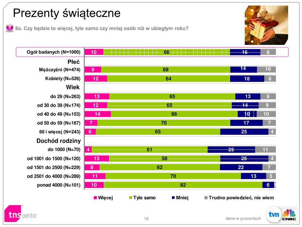 Prezenty świąteczne 8a. Czy będzie to więcej, tyle samo czy mniej osób niż w ubiegłym roku? Płeć Wiek Dochód rodziny dane w procentach