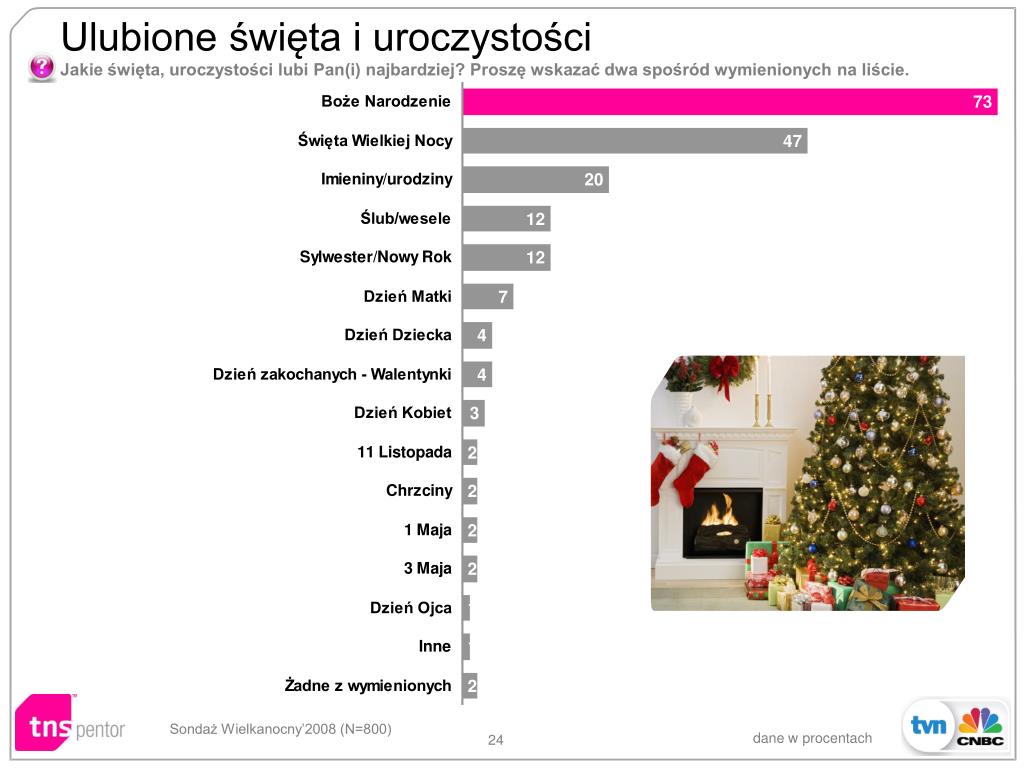 Ulubione święta i uroczystości Jakie święta, uroczystości lubi Pan(i) najbardziej? Proszę wskazać dwa spośród wymienionych na liście. Sondaż Wielkanocny’2008 (N=800) dane w procentach