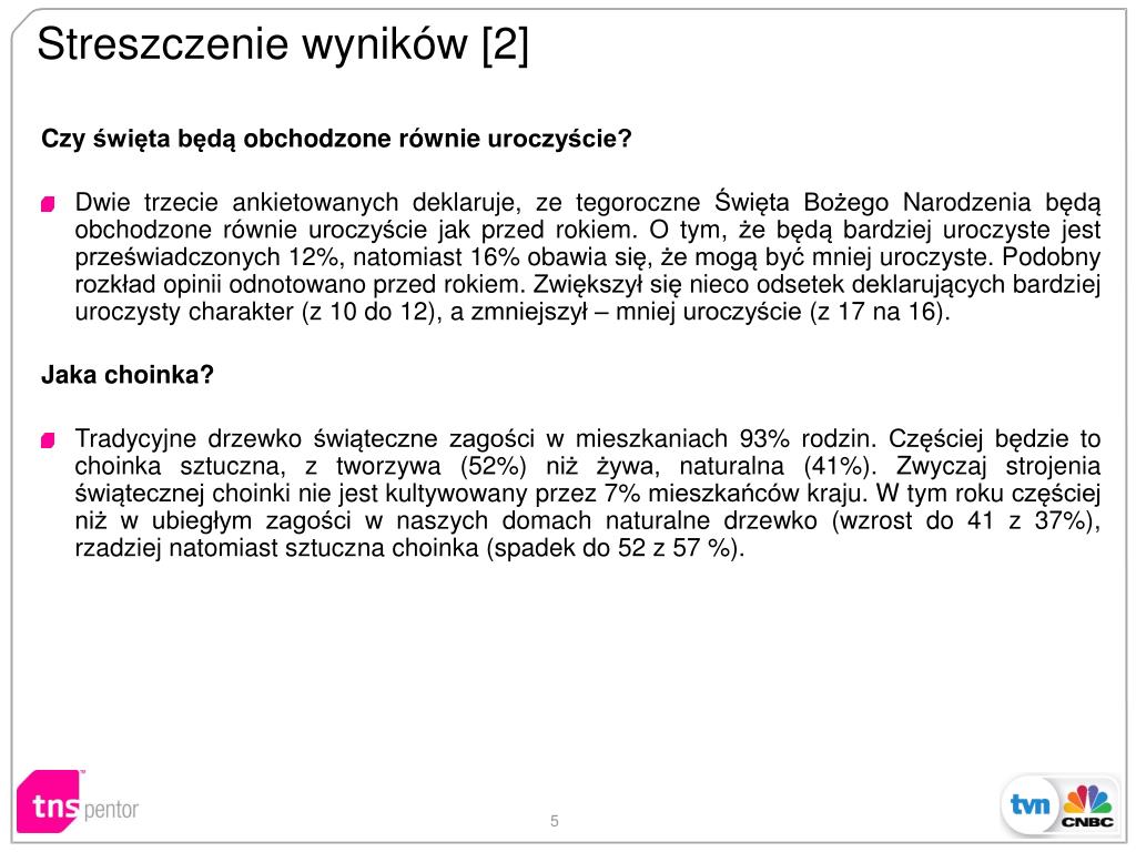 Czy święta będą obchodzone równie uroczyście? Dwie trzecie ankietowanych deklaruje, ze tegoroczne Święta Bożego Narodzenia będą obchodzone równie uroczyście jak przed rokiem. O tym, że będą bardziej uroczyste jest przeświadczonych 12%, natomiast 16% obawia się, że mogą być mniej uroczyste. Podobny rozkład opinii odnotowano przed rokiem. Zwiększył się nieco odsetek deklarujących bardziej uroczysty charakter (z 10 do 12), a zmniejszył – mniej uroczyście (z 17 na 16). Jaka choinka? Tradycyjne drzewko świąteczne zagości w mieszkaniach 93% rodzin. Częściej będzie to choinka sztuczna, z tworzywa (52%) niż żywa, naturalna (41%). Zwyczaj strojenia świątecznej choinki nie jest kultywowany przez 7% mieszkańców kraju. W tym roku częściej niż w ubiegłym zagości w naszych domach naturalne drzewko (wzrost do 41 z 37%), rzadziej natomiast sztuczna choinka (spadek do 52 z 57 %). Streszczenie wyników [2]