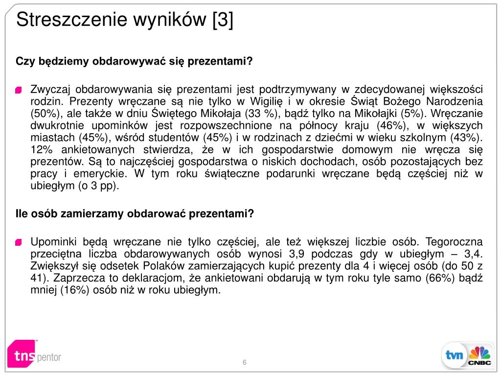 Czy będziemy obdarowywać się prezentami? Zwyczaj obdarowywania się prezentami jest podtrzymywany w zdecydowanej większości rodzin. Prezenty wręczane są nie tylko w Wigilię i w okresie Świąt Bożego Narodzenia (50%), ale także w dniu Świętego Mikołaja (33 %), bądź tylko na Mikołajki (5%). Wręczanie dwukrotnie upominków jest rozpowszechnione na północy kraju (46%), w większych miastach (45%), wśród studentów (45%) i w rodzinach z dziećmi w wieku szkolnym (43%). 12% ankietowanych stwierdza, że w ich gospodarstwie domowym nie wręcza się prezentów. Są to najczęściej gospodarstwa o niskich dochodach, osób pozostających bez pracy i emeryckie. W tym roku świąteczne podarunki wręczane będą częściej niż w ubiegłym (o 3 pp). Ile osób zamierzamy obdarować prezentami? Upominki będą wręczane nie tylko częściej, ale też większej liczbie osób. Tegoroczna przeciętna liczba obdarowywanych osób wynosi 3,9 podczas gdy w ubiegłym – 3,4. Zwiększył się odsetek Polaków zamierzających kupić prezenty dla 4 i więcej osób (do 50 z 41). Zaprzecza to deklaracjom, że ankietowani obdarują w tym roku tyle samo (66%) bądź mniej (16%) osób niż w roku ubiegłym. Streszczenie wyników [3]
