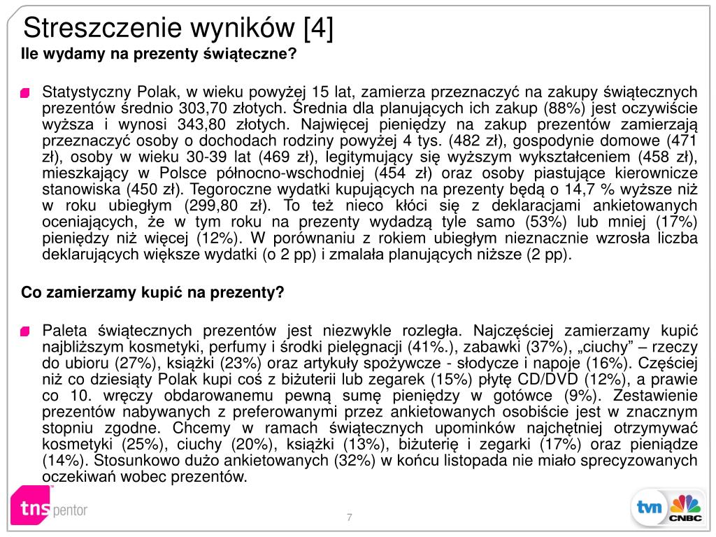 Ile wydamy na prezenty świąteczne? Statystyczny Polak, w wieku powyżej 15 lat, zamierza przeznaczyć na zakupy świątecznych prezentów średnio 303,70 złotych. Średnia dla planujących ich zakup (88%) jest oczywiście wyższa i wynosi 343,80 złotych. Najwięcej pieniędzy na zakup prezentów zamierzają przeznaczyć osoby o dochodach rodziny powyżej 4 tys. (482 zł), gospodynie domowe (471 zł), osoby w wieku 30-39 lat (469 zł), legitymujący się wyższym wykształceniem (458 zł), mieszkający w Polsce północno-wschodniej (454 zł) oraz osoby piastujące kierownicze stanowiska (450 zł). Tegoroczne wydatki kupujących na prezenty będą o 14,7 % wyższe niż w roku ubiegłym (299,80 zł). To też nieco kłóci się z deklaracjami ankietowanych oceniających, że w tym roku na prezenty wydadzą tyle samo (53%) lub mniej (17%) pieniędzy niż więcej (12%). W porównaniu z rokiem ubiegłym nieznacznie wzrosła liczba deklarujących większe wydatki (o 2 pp) i zmalała planujących niższe (2 pp). Co zamierzamy kupić na prezenty? Paleta świątecznych prezentów jest niezwykle rozległa. Najczęściej zamierzamy kupić najbliższym kosmetyki, perfumy i środki pielęgnacji (41%.), zabawki (37%), „ciuchy” – rzeczy do ubioru (27%), książki (23%) oraz artykuły spożywcze - słodycze i napoje (16%). Częściej niż co dziesiąty Polak kupi coś z biżuterii lub zegarek (15%) płytę CD/DVD (12%), a prawie co 10. wręczy obdarowanemu pewną sumę pieniędzy w gotówce (9%). Zestawienie prezentów nabywanych z preferowanymi przez ankietowanych osobiście jest w znacznym stopniu zgodne. Chcemy w ramach świątecznych upominków najchętniej otrzymywać kosmetyki (25%), ciuchy (20%), książki (13%), biżuterię i zegarki (17%) oraz pieniądze (14%). Stosunkowo dużo ankietowanych (32%) w końcu listopada nie miało sprecyzowanych oczekiwań wobec prezentów. Streszczenie wyników [4]