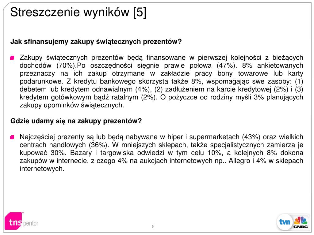 Jak sfinansujemy zakupy świątecznych prezentów? Zakupy świątecznych prezentów będą finansowane w pierwszej kolejności z bieżących dochodów (70%).Po oszczędności sięgnie prawie połowa (47%). 8% ankietowanych przeznaczy na ich zakup otrzymane w zakładzie pracy bony towarowe lub karty podarunkowe. Z kredytu bankowego skorzysta także 8%, wspomagając swe zasoby: (1) debetem lub kredytem odnawialnym (4%), (2) zadłużeniem na karcie kredytowej (2%) i (3) kredytem gotówkowym bądź ratalnym (2%). O pożyczce od rodziny myśli 3% planujących zakupy upominków świątecznych. Gdzie udamy się na zakupy prezentów? Najczęściej prezenty są lub będą nabywane w hiper i supermarketach (43%) oraz wielkich centrach handlowych (36%). W mniejszych sklepach, także specjalistycznych zamierza je kupować 30%. Bazary i targowiska odwiedzi w tym celu 10%, a kolejnych 8% dokona zakupów w internecie, z czego 4% na aukcjach internetowych np.. Allegro i 4% w sklepach internetowych. Streszczenie wyników [5]