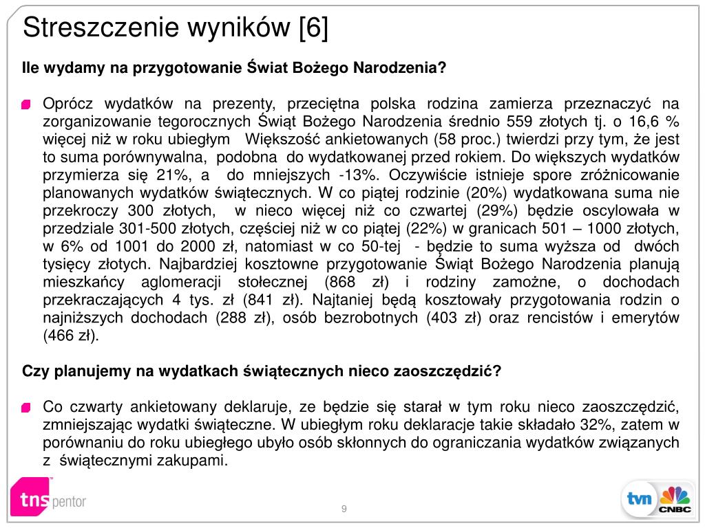 Streszczenie wyników [6] Ile wydamy na przygotowanie Świat Bożego Narodzenia? • Oprócz wydatków na prezenty, przeciętna polska rodzina zamierza przeznaczyć na zorganizowanie tegorocznych Świąt Bożego Narodzenia średnio 559 złotych tj. o 16,6 % więcej niż w roku ubiegłym Większość ankietowanych (58 proc.) twierdzi przy tym, że jest to suma porównywalna, podobna do wydatkowanej przed rokiem. Do większych wydatków przymierza się 21%, a do mniejszych -13%. Oczywiście istnieje spore zróżnicowanie planowanych wydatków świątecznych. W co piątej rodzinie (20%) wydatkowana suma nie przekroczy 300 złotych, w nieco więcej niż co czwartej (29%) będzie oscylowała w przedziale 301-500 złotych, częściej niż w co piątej (22%) w granicach 501 – 1000 złotych, w 6% od 1001 do 2000 zł, natomiast w co 50-tej - będzie to suma wyższa od dwóch tysięcy złotych. Najbardziej kosztowne przygotowanie Świąt Bożego Narodzenia planują mieszkańcy aglomeracji stołecznej (868 zł) i rodziny zamożne, o dochodach przekraczających 4 tys. zł (841 zł). Najtaniej będą kosztowały przygotowania rodzin o najniższych dochodach (288 zł), osób bezrobotnych (403 zł) oraz rencistów i emerytów (466 zł). Czy planujemy na wydatkach świątecznych nieco zaoszczędzić? • Co czwarty ankietowany deklaruje, ze będzie się starał w tym roku nieco zaoszczędzić, zmniejszając wydatki świąteczne. W ubiegłym roku deklaracje takie składało 32%, zatem w porównaniu do roku ubiegłego ubyło osób skłonnych do ograniczania wydatków związanych z świątecznymi zakupami.