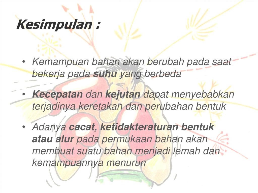 Kesimpulan : • Kemampuanbahanakanberubahpadasaatbekerjapadasuhu yang berbeda • Kecepatandankejutandapatmenyebabkanterjadinyakeretakandanperubahanbentuk • Adanyacacat, ketidakteraturanbentukataualurpadapermukaanbahanakanmembuatsuatubahanmenjadilemah dan kemampuannyamenurun