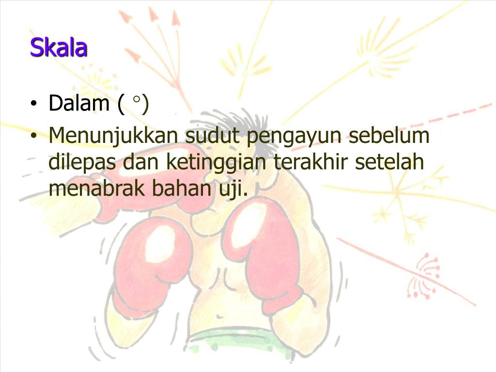 Skala • Dalam ( °) • Menunjukkan sudut pengayun sebelum dilepas dan ketinggian terakhir setelah menabrak bahan uji.