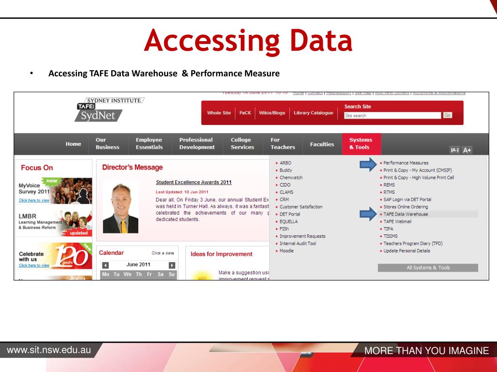 Accessing Data • Accessing TAFE Data Warehouse & Performance Measure