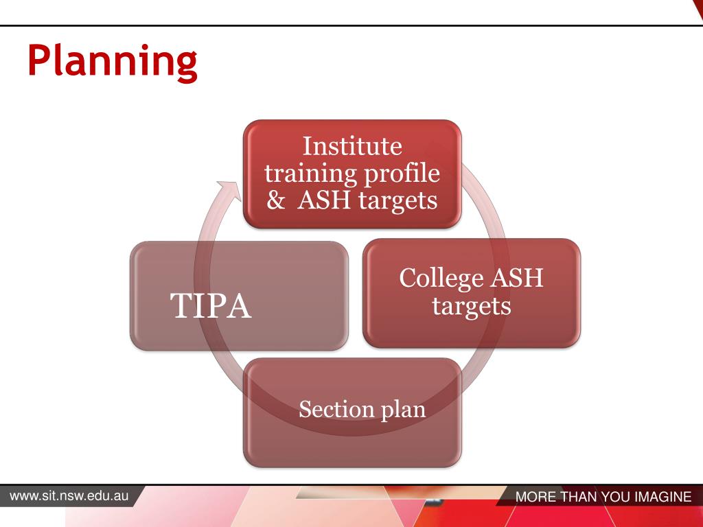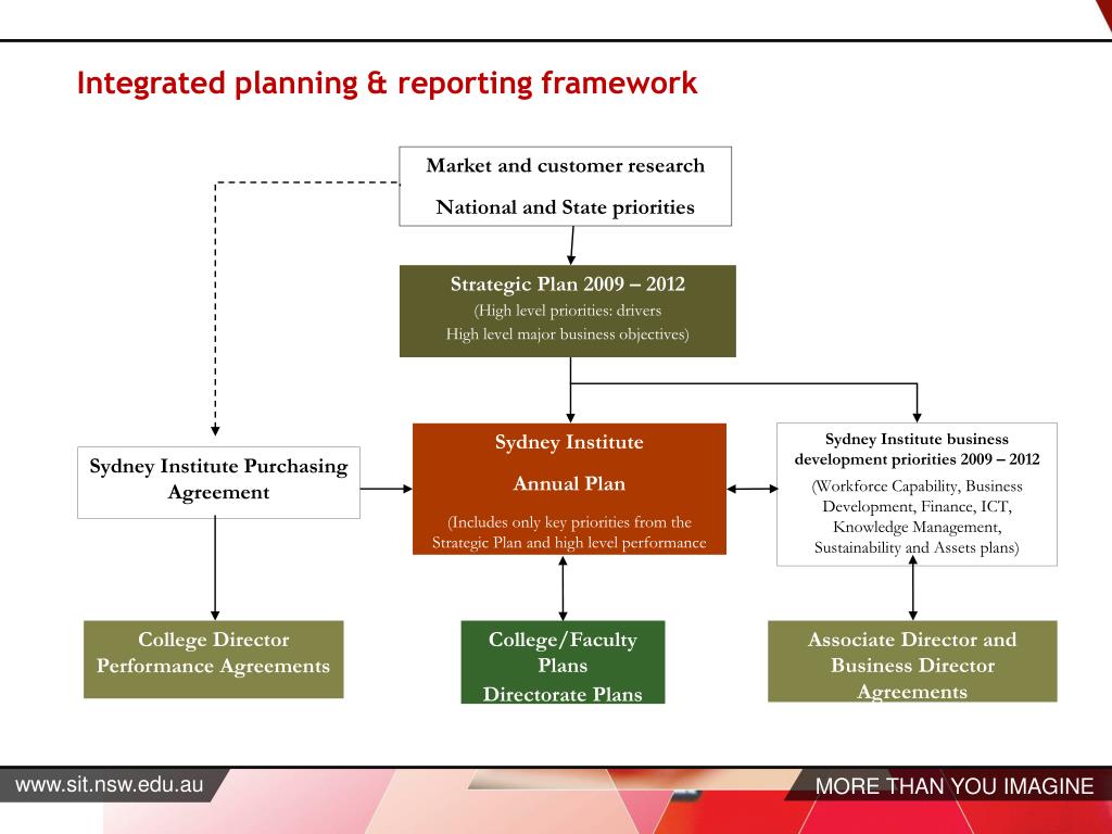 Market and customer research National and State priorities Strategic Plan 2009 – 2012 (High level priorities: drivers High level major business objectives) Sydney Institute business development priorities 2009 – 2012 (Workforce Capability, Business Development, Finance, ICT, Knowledge Management, Sustainability and Assets plans) Sydney Institute Annual Plan (Includes only key priorities from the Strategic Plan and high level performance measures from the Purchasing Agreement) Sydney Institute Purchasing Agreement College Director Performance Agreements College/Faculty Plans Directorate Plans Associate Director and Business Director Agreements Integrated planning & reporting framework