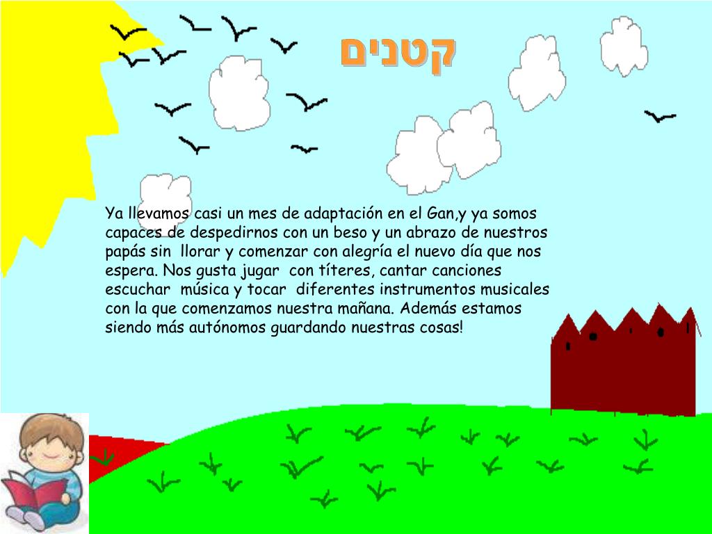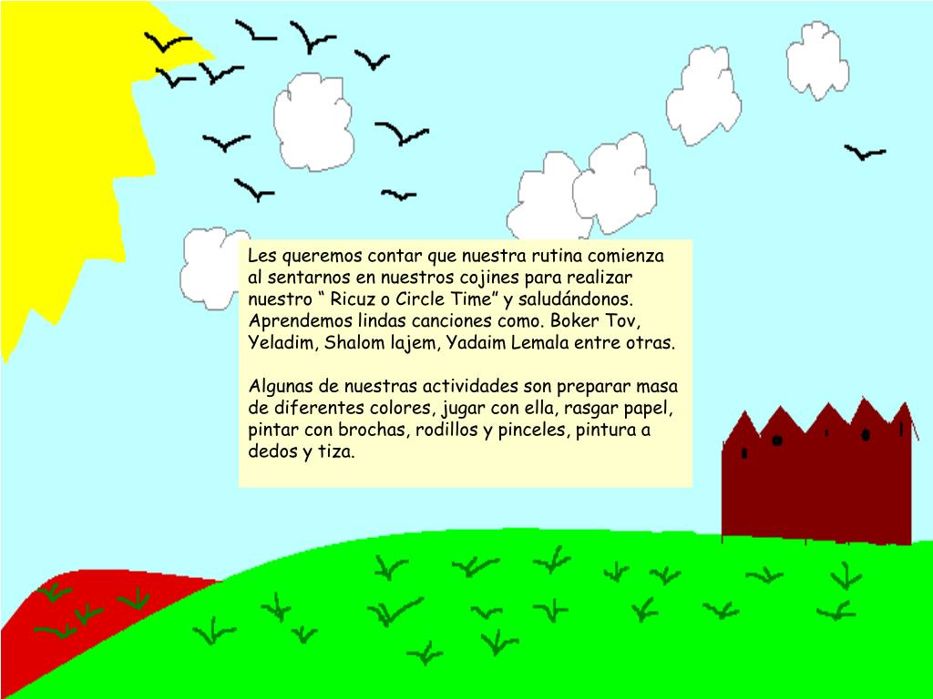 Les queremos contar que nuestra rutina comienza al sentarnos en nuestros cojines para realizar nuestro “ Ricuz o Circle Time” y saludándonos. Aprendemos lindas canciones como. Boker Tov, Yeladim, Shalom lajem, Yadaim Lemala entre otras. Algunas de nuestras actividades son preparar masa de diferentes colores, jugar con ella, rasgar papel, pintar con brochas, rodillos y pinceles, pintura a dedos y tiza.