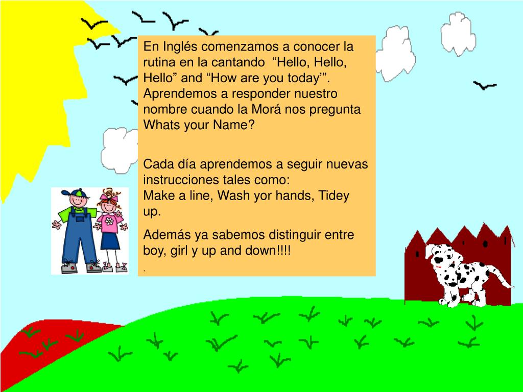 En Inglés comenzamos a conocer la rutina en la cantando “Hello, Hello, Hello” and “How are you today’”. Aprendemos a responder nuestro nombre cuando la Morá nos pregunta Whats your Name? Cada día aprendemos a seguir nuevas instrucciones tales como: Make a line, Wash yor hands, Tidey up. Además ya sabemos distinguir entre boy, girl y up and down!!!! .