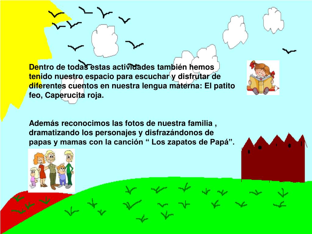 Dentro de todas estas actividades también hemos tenido nuestro espacio para escuchar y disfrutar de diferentes cuentos en nuestra lengua materna: El patito feo, Caperucita roja. Además reconocimos las fotos de nuestra familia , dramatizando los personajes y disfrazándonos de papas y mamas con la canción “ Los zapatos de Papá”.