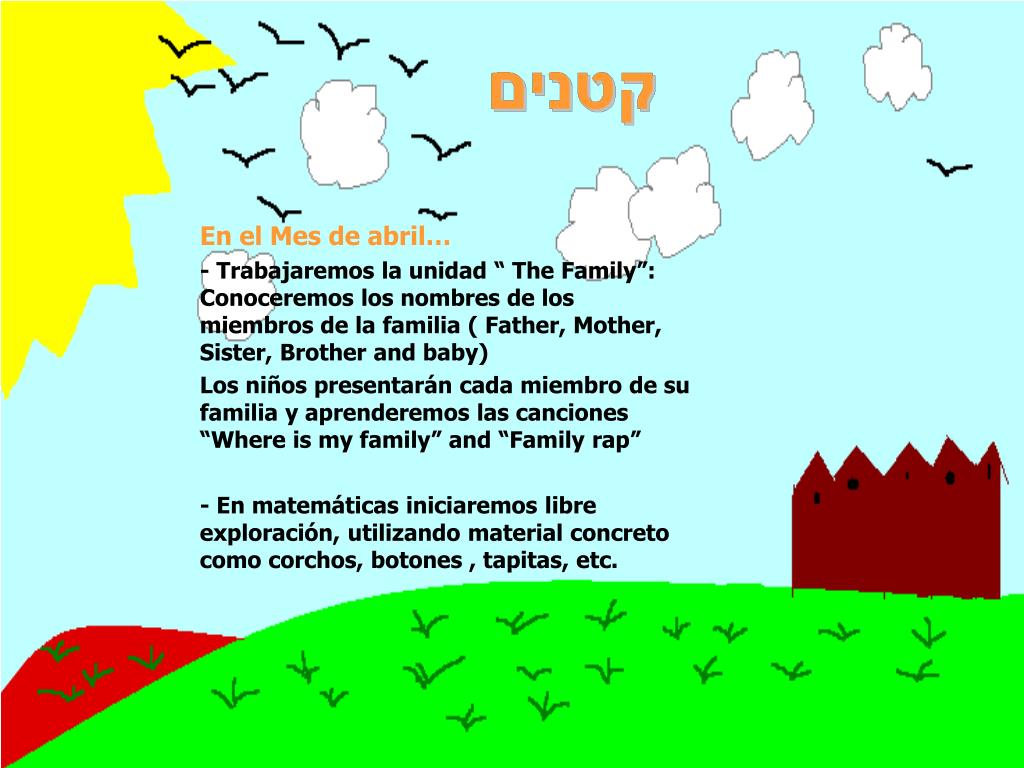 En el Mes de abril… - Trabajaremos la unidad “ The Family”: Conoceremos los nombres de los miembros de la familia ( Father, Mother, Sister, Brother and baby) Los niños presentarán cada miembro de su familia y aprenderemos las canciones “Where is my family” and “Family rap” - En matemáticas iniciaremos libre exploración, utilizando material concreto como corchos, botones , tapitas, etc.