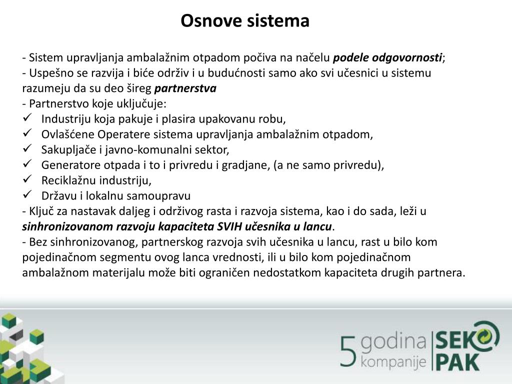 SEKOPAK d.o.o. Odgovornost koja se isplati. Sadržaj. Prve tri godine sistema upravljanja ambala ž nim otpadom Gde smo danas Pogled u budućnost: 2013, 2014+ Zaključ ak. Osnove sistema. - Sistem upravljanja ambalažnim otpadom počiva na načelu podele odgovornosti ;