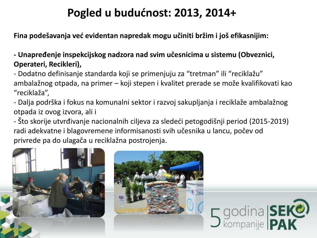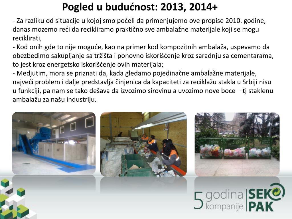 Pogled u budućnost: 2013, 2014+ - Za razliku od situacije u kojojsmopočelida primenjujemoovepropise 2010. godine, danasmozemoreći da recikliramopraktično sveambalažne materijalekoji se mogu reciklirati, - Kodonihgde to nijemoguće, kaona primer kodkompozitnihambalaža, uspevamo da obezbedimosakupljanjesatržišta i ponovnoiskorišćenjekrozsaradnjusacementarama, to jest krozenergetskoiskorišćenjeovihmaterijala; - Medjutim, mora se priznati da, kadagledamopojedinačne ambalažne materijale, najveći problem i daljepredstavljačinjenicada kapacitetizareciklažu stakla u Srbijinisu u funkciji, pa nam se takodešavada izvozimosirovinu a uvozimonoveboce– tj staklenu ambalažu zanašu industriju.