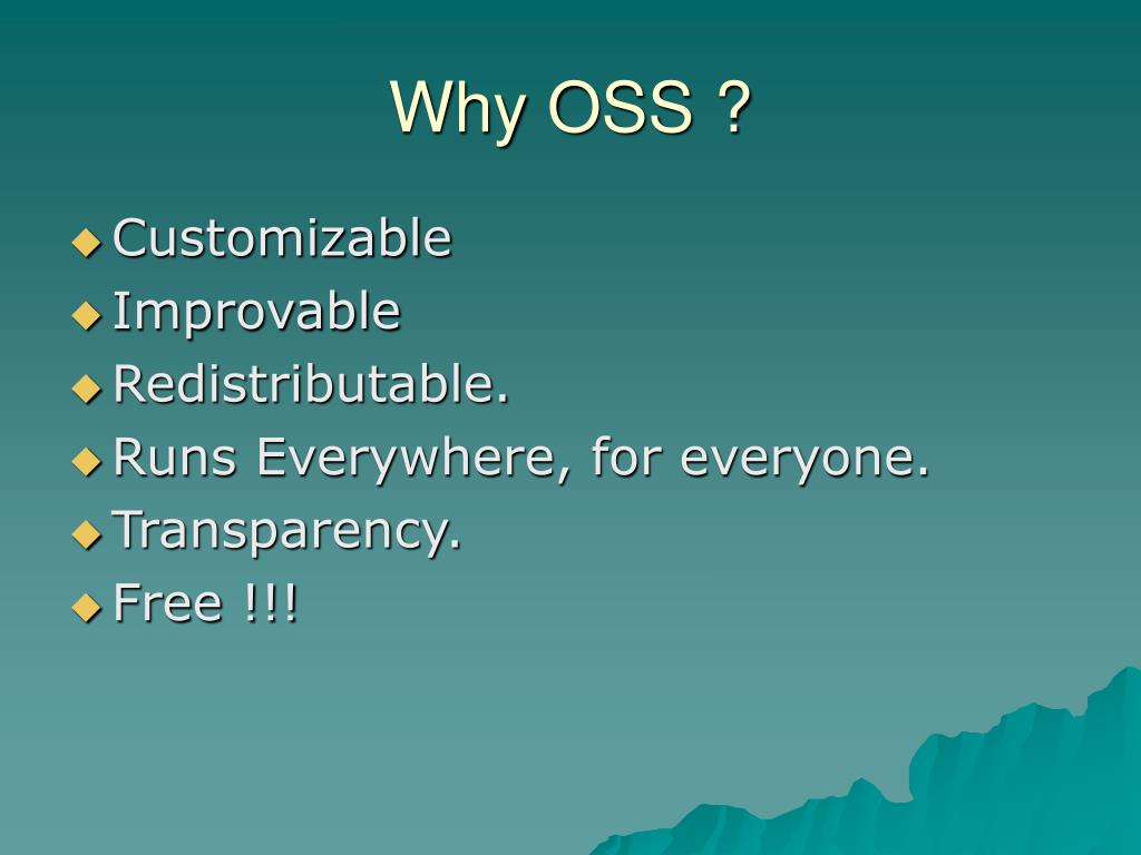 Why OSS ? • Customizable • Improvable • Redistributable. • Runs Everywhere, for everyone. • Transparency. • Free !!!