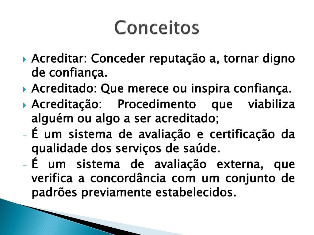 Conceitos • Acreditar: Conceder reputação a, tornar digno de confiança. • Acreditado: Que merece ou inspira confiança. • Acreditação: Procedimento que viabiliza alguém ou algo a ser acreditado; • É um sistema de avaliação e certificação da qualidade dos serviços de saúde. • É um sistema de avaliação externa, que verifica a concordância com um conjunto de padrões previamente estabelecidos.