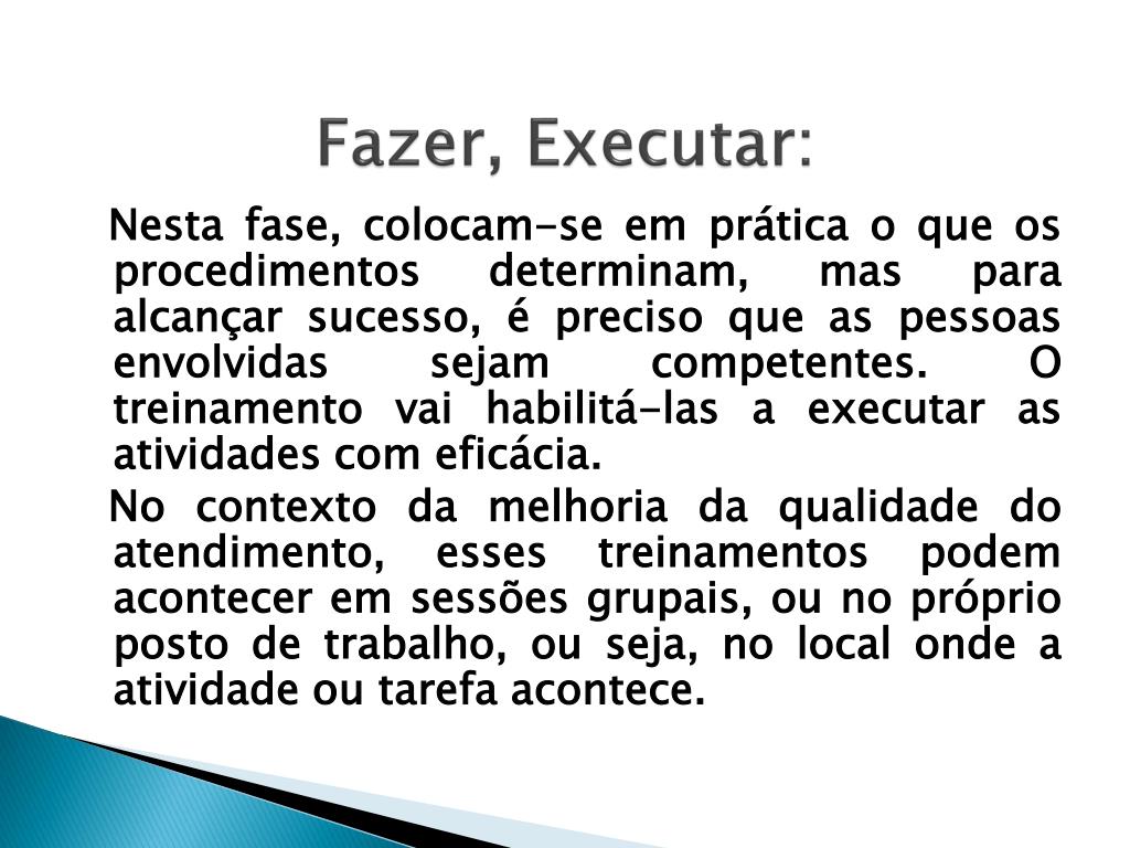 Fazer, Executar: Nesta fase, colocam-se em prática o que os procedimentos determinam, mas para alcançar sucesso, é preciso que as pessoas envolvidas sejam competentes. O treinamento vai habilitá-las a executar as atividades com eficácia. No contexto da melhoria da qualidade do atendimento, esses treinamentos podem acontecer em sessões grupais, ou no próprio posto de trabalho, ou seja, no local onde a atividade ou tarefa acontece.