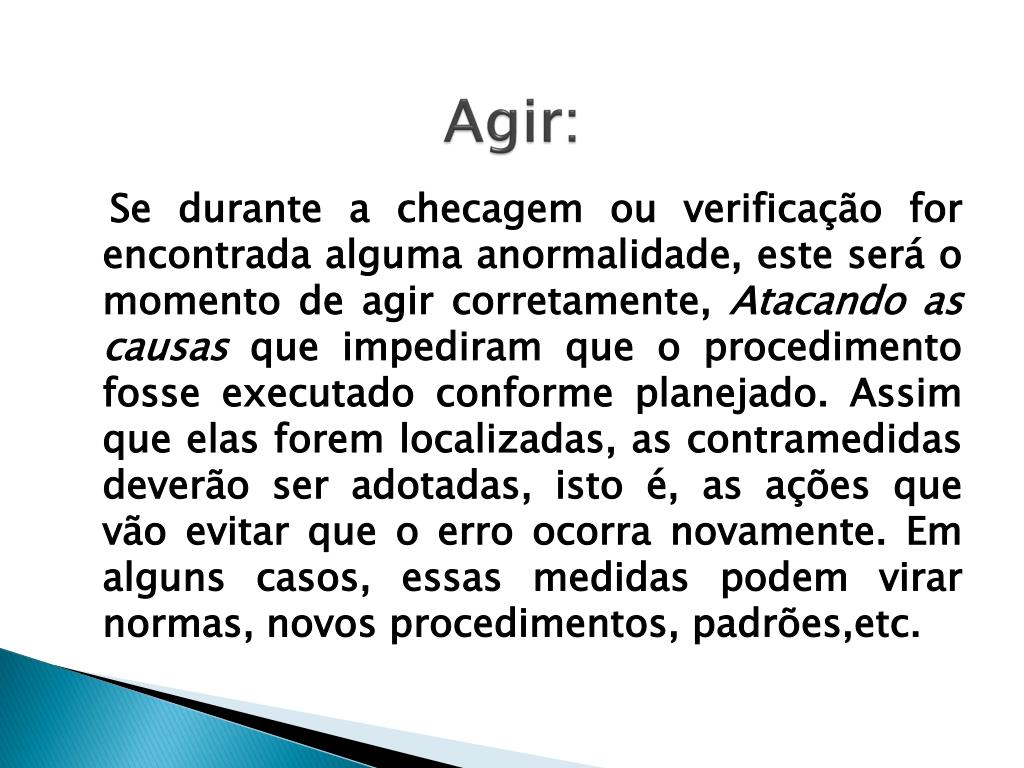 Agir: Se durante a checagem ou verificação for encontrada alguma anormalidade, este será o momento de agir corretamente, Atacando as causas que impediram que o procedimento fosse executado conforme planejado. Assim que elas forem localizadas, as contramedidas deverão ser adotadas, isto é, as ações que vão evitar que o erro ocorra novamente. Em alguns casos, essas medidas podem virar normas, novos procedimentos, padrões,etc.