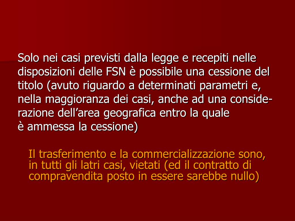 Solo nei casi previsti dalla legge e recepiti nelle disposizioni delle FSN è possibile una cessione del titolo (avuto riguardo a determinati parametri e, nella maggioranza dei casi, anche ad una conside- razione dell’area geografica entro la quale è ammessa la cessione) Il trasferimento e la commercializzazione sono, in tutti gli latri casi, vietati (ed il contratto di compravendita posto in essere sarebbe nullo)