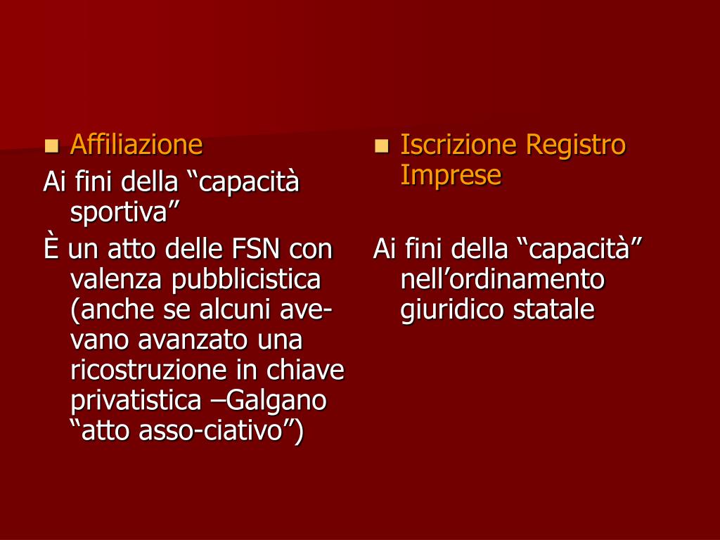 Affiliazione Ai fini della “capacità sportiva” È un atto delle FSN con valenza pubblicistica (anche se alcuni ave-vano avanzato una ricostruzione in chiave privatistica –Galgano “atto asso-ciativo”) Iscrizione Registro Imprese Ai fini della “capacità” nell’ordinamento giuridico statale