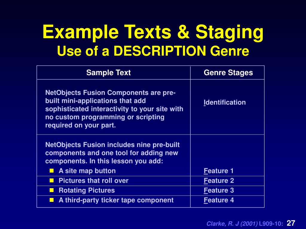 Example Texts & Staging • the following texts are provided from NetObjects training materials: • Example 1: uses a DESCRIPTION genre to describe what NetObjects Fusion components are like • Example 2: uses a PROCEDURE and a DESCRIPTION Genre to Add a Site Map Button Component