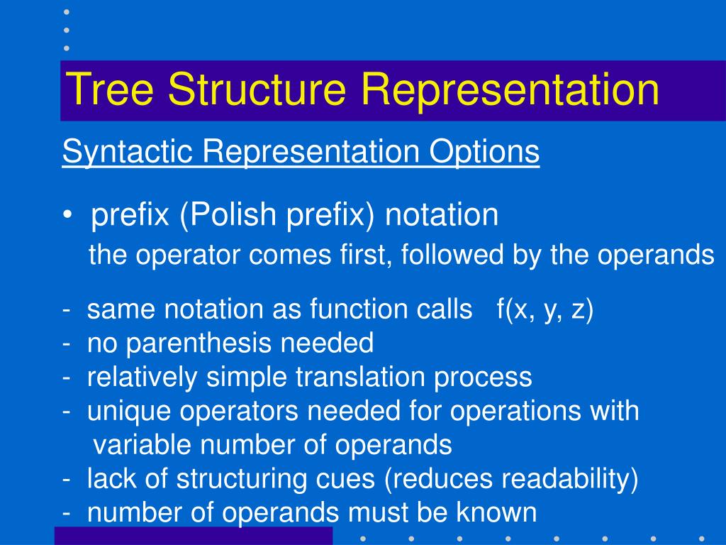 Tree Structure Representation Syntactic Representation Options • postfix or reverse Polish notation (RPN) • the operands are written first, followed by the • operator • - advantages and disadvantages similar to prefix