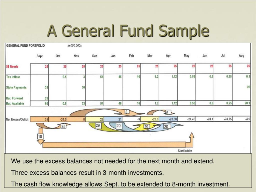 A General Fund Sample We use the excess balances not needed for the next month and extend. Three excess balances result in 3-month investments. The cash flow knowledge allows Sept. to be extended to 8-month investment.