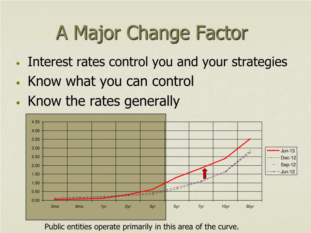 A Major Change Factor • Interest rates control you and your strategies • Know what you can control • Know the rates generally Public entities operate primarily in this area of the curve.