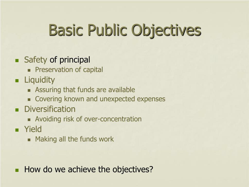 Basic Public Objectives • Safety of principal • Preservation of capital • Liquidity • Assuring that funds are available • Covering known and unexpected expenses • Diversification • Avoiding risk of over-concentration • Yield • Making all the funds work • How do we achieve the objectives?
