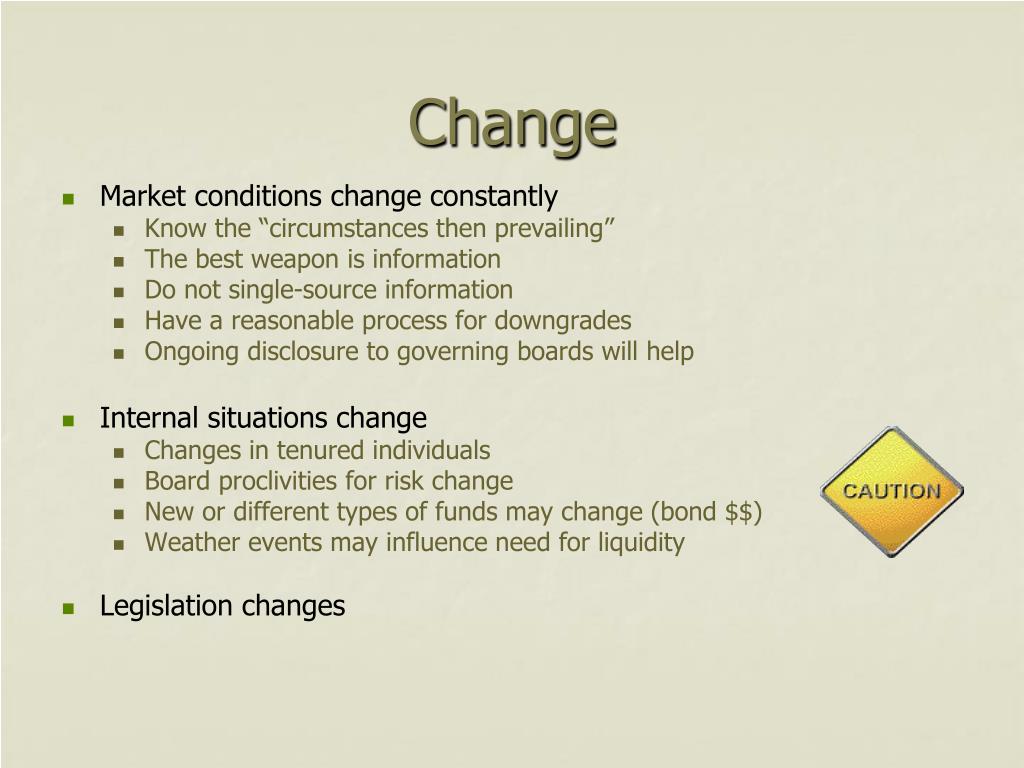 Change • Market conditions change constantly • Know the “circumstances then prevailing” • The best weapon is information • Do not single-source information • Have a reasonable process for downgrades • Ongoing disclosure to governing boards will help • Internal situations change • Changes in tenured individuals • Board proclivities for risk change • New or different types of funds may change (bond $$) • Weather events may influence need for liquidity • Legislation changes