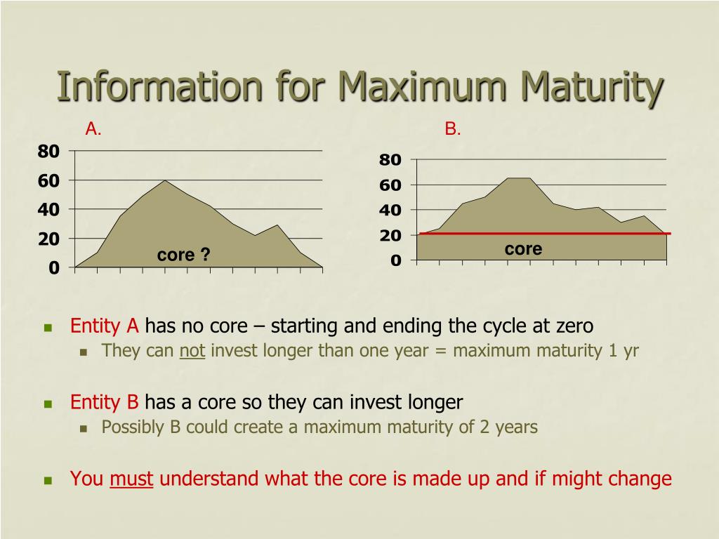 Information for Maximum Maturity A. B. core core ? • Entity A has no core – starting and ending the cycle at zero • They can not invest longer than one year = maximum maturity 1 yr • Entity B has a core so they can invest longer • Possibly B could create a maximum maturity of 2 years • You must understand what the core is made up and if might change